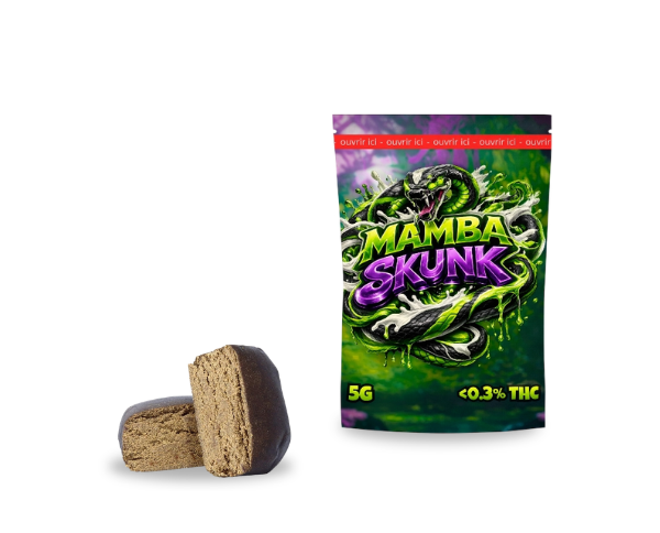 Le Hash Mamba Skunk dévoile un profil aromatique dense et percutant, où la puissance typique de la Skunk rencontre une gourmandise plus sombre, plus ronde et plus enveloppante 🐍